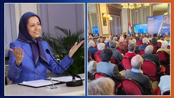 Die Hauptrede hielt Maryam Rajavi, die designierte Präsidentin des Nationalen Widerstandsrates Iran (NWRI). Frau Rajavi bezeichnete die aktuelle Gewaltwelle nicht bloß als Justizirrtum, sondern als strategischen Krieg einer fragilen Diktatur gegen die eigene Bevölkerung.